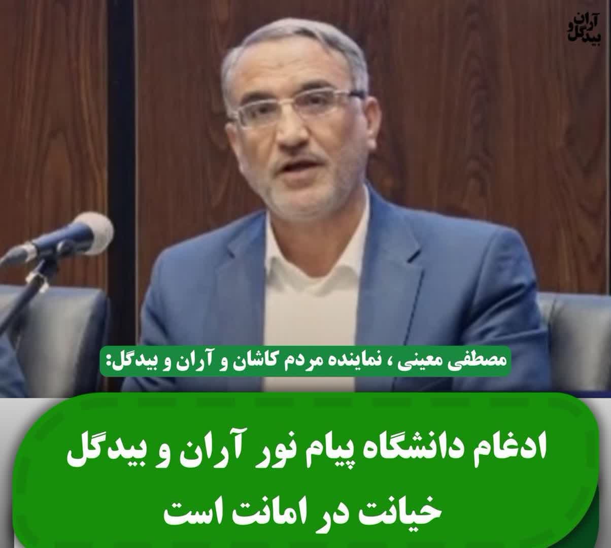 ادغام دانشگاه پیام نور آران و بیدگل خیانت در امانت است.به گزارش مرکز ارتباطات و رسانهٔ دفتر نماینده مردم شریف "کاشان" و " آران و بیدگل "، دکتر مصطفی معینی در حاشیه سفر استاندار اصفهان به آران و بیدگل در پاسخ به پرسش خبرنگاران در خصوص شایعه ادغام و حذف دانشگاه پیام نور آران وبیدگل در طرح آمایش دانشگاه گفت: دانشگاه پیام نور آران و بیدگل از شمار معدود دانشگاه های است که در دهه 70 ...