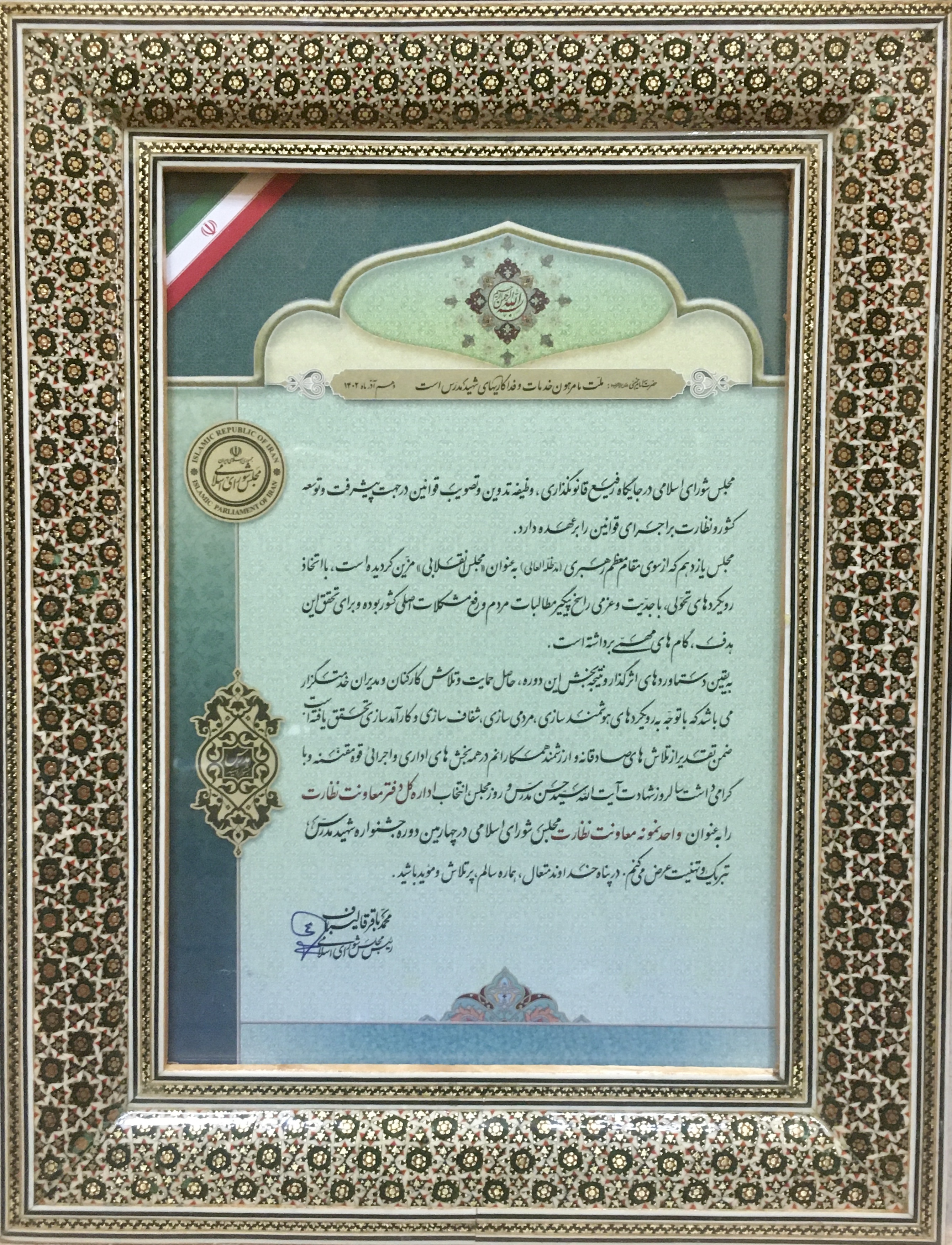 دریافت لوح تقدیر از ریاست محترم مجلس